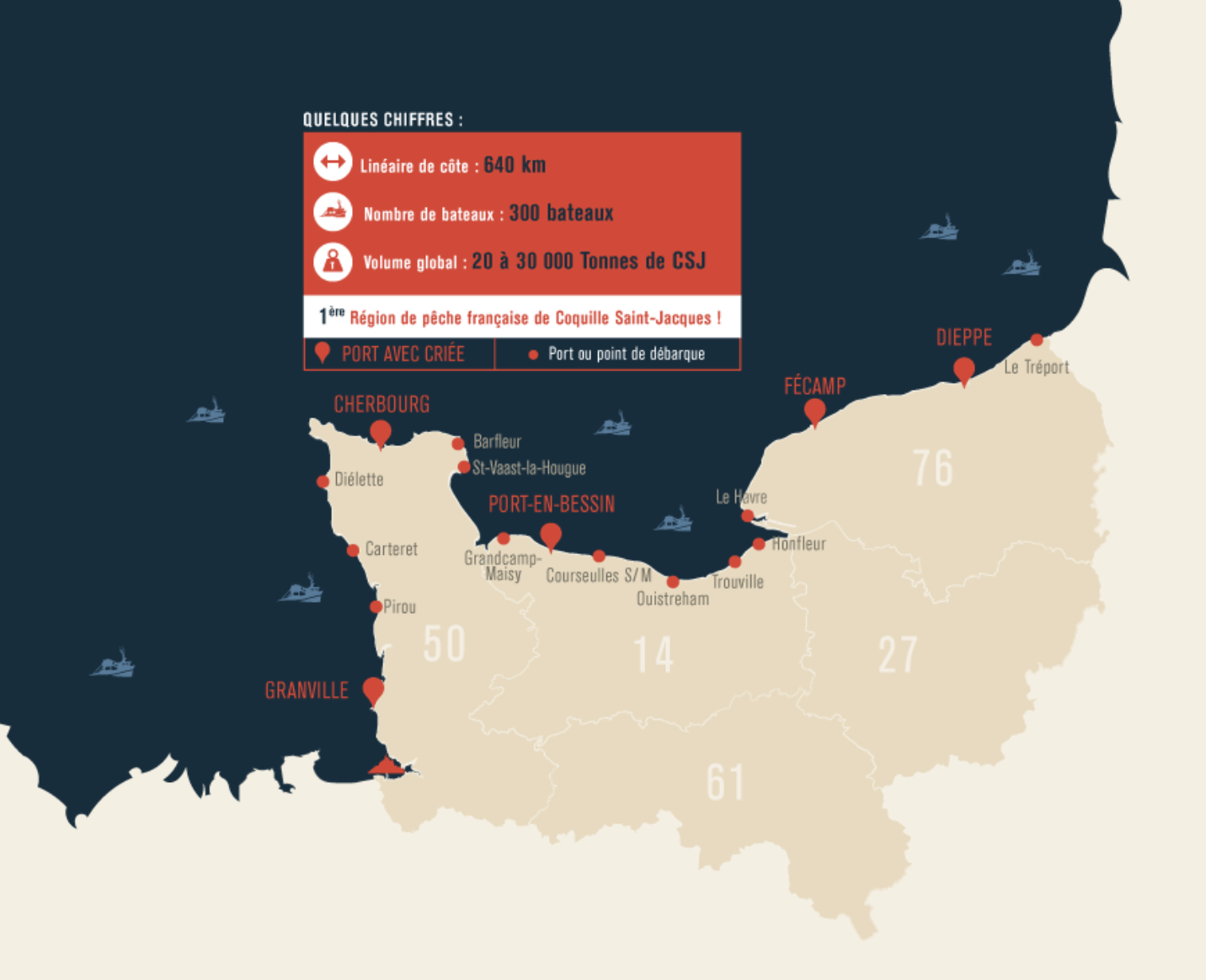 20 à 30 000 Tonnes y sont pêchées chaque année, soit près d’1/3 des captures totales de la pêche normande et plus des 2/3 des captures françaises de coquilles Saint-Jacques.