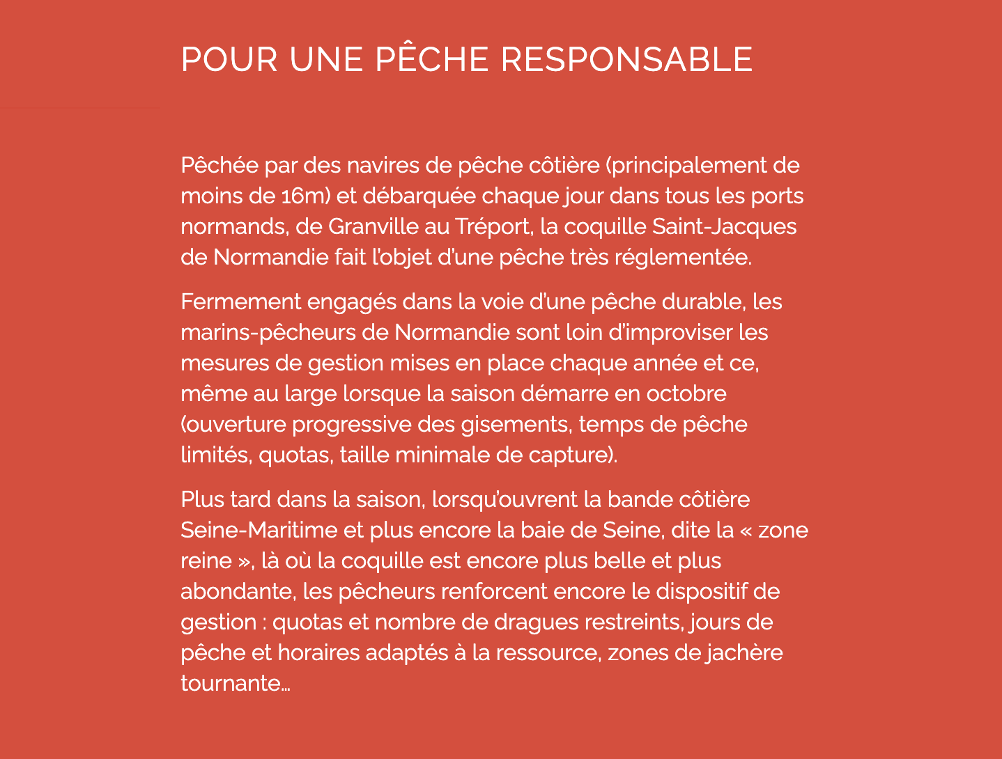 Fermement engagés dans la voie d’une pêche durable, les marins-pêcheurs de Normandie sont loin d’improviser les mesures de gestion mises en place chaque année et ce, même au large lorsque la saison démarre en octobre (ouverture progressive des gisements, temps de pêche limités, quotas, taille minimale de capture).