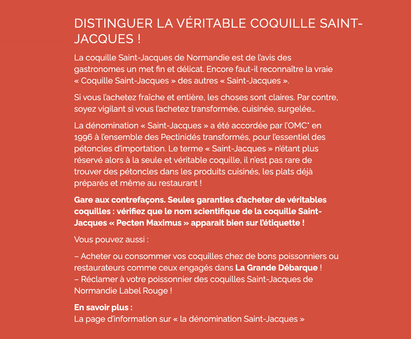 Gare aux contrefaçons. Seules garanties d’acheter de véritables coquilles : vérifiez que le nom scientifique de la coquille Saint-Jacques « Pecten Maximus » apparait bien sur l’étiquette !
