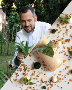 Un grand-père qui a son propre jardin, ses volailles, et qui vous embarque à la chasse, à la pêche, à la cueillette des champignons ou à la « chasse » aux escargots… C’est un rêve de gamin qui peut tourner à la vocation ? L’amour de la nature et des bons produits, David Gallienne a hérité de tout ça et bien plus encore durant son enfance normande… Donc, ce sera cuisinier ou rien ! Un apprentissage à l’Escargot, à Alençon, un BEP Hôtellerie-restauration, un Brevet Professionnel de Cuisine, le titre de Vice-champion de France aux Olympiades des métiers… Voilà pour les premières lignes de son CV qui indique aussi une dizaine d’années passées dans un restaurant étoilé de Bagnoles-de-l’Orne, où il gravit tous les échelons, et un poste de chef exécutif chez Origine, à Rouen. Mais c’est au cours d’un voyage au Japon qu’il fait une rencontre décisive, celle d’Eric Guérin, chef de la Mare aux Oiseaux, en Grande Brière. Ces deux-là se découvrent une philosophie et une sensibilité communes… Le retour dans l’Hexagone ne gâche pas leur entente, au contraire, et David rejoint bientôt Eric engagé à la création du Jardin des Plumes, à Giverny. Ce dernier lui passe peu à peu le témoin, puis carrément les clefs des fourneaux, avant que David, début 2020, ne devienne propriétaire de ces lieux magnifiques. Ancrée sur son terroir et volontiers inspirée d’échappées belles à l’étranger, sa cuisine y a trouvé une identité forte et personnelle, à la fois surprenante, équilibrée et responsable.